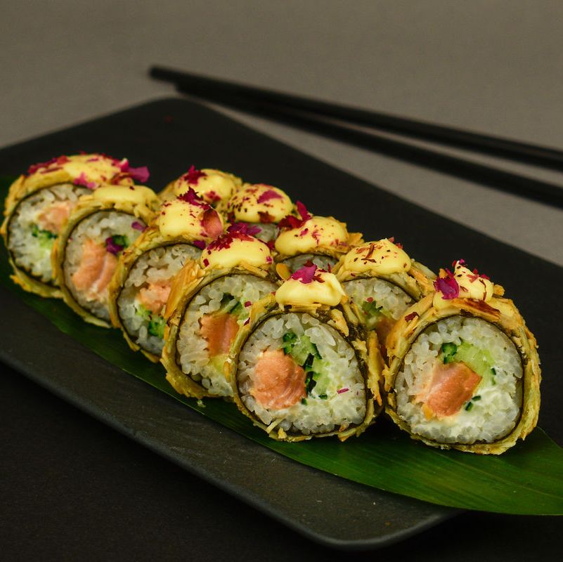 TarTar Salmon, Tempura, Pepino, Aguacate, Queso Crema, Arroz, Nori. 8 pza./300g