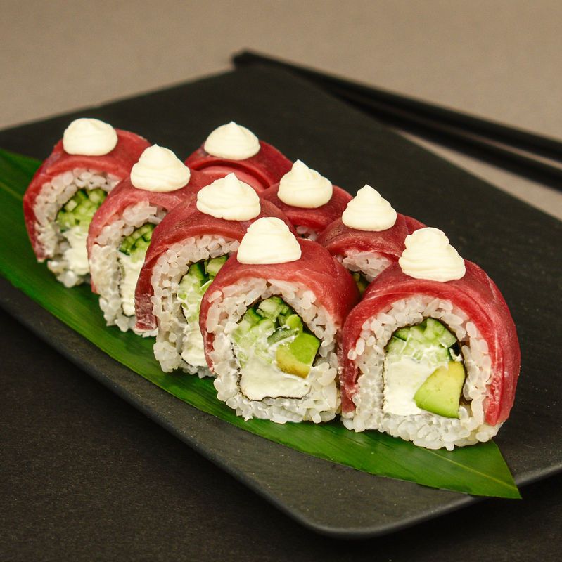 Atun, Aceite de sésamo, Ebi Panko, Daikon, Queso Crema, Arroz, Nori. 8 pza./280g